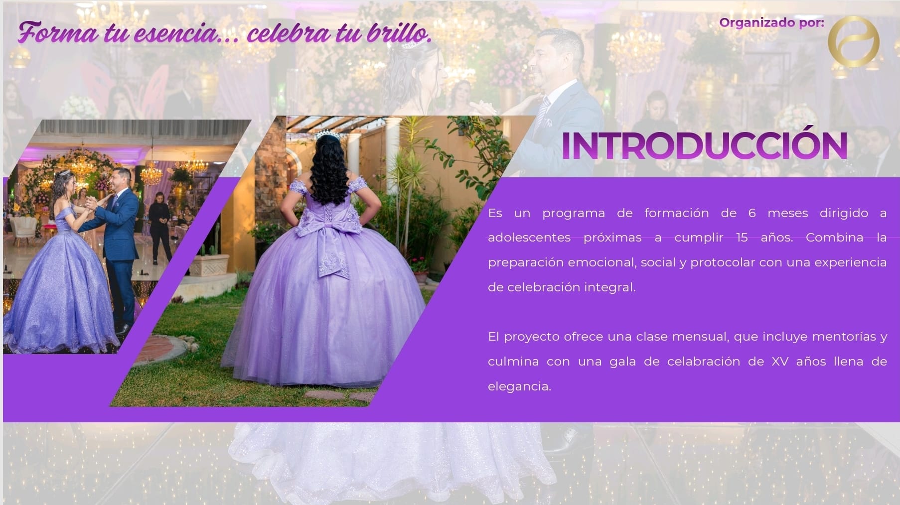 Es un programa de formación de 6 meses dirigido a adolescentes próximas a cumplir 15 años. Combina la preparación emocional, social y protocolar con una experiencia de celebración integral.
